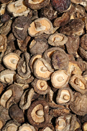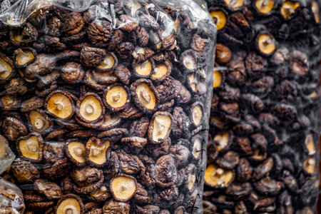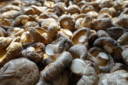 Dried shiitake mushrooms piled up on the counter of a market for sale as an ingredient