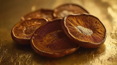 Fresh shiitake mushrooms are displayed on a wooden cutting board, showcasing their delicate gills and rich textures. The scene captures natural sheen and soft lighting, enhancing their appeal.