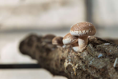 Fresh shiitake mushrooms growing up on mycelial block, homemade cultivation