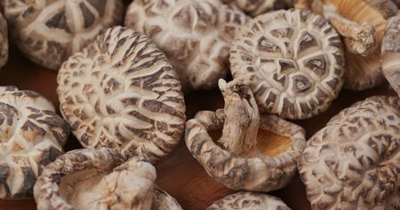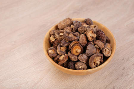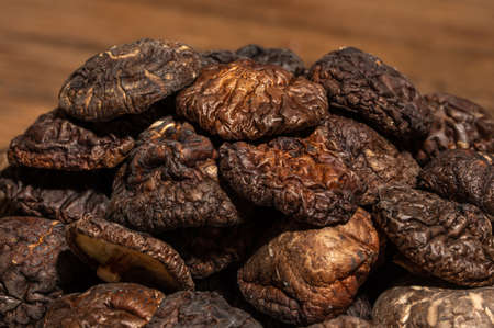 Top view of dried shiitake mushroom on wooden table, selective focus