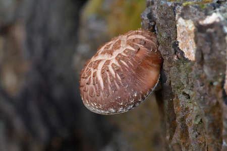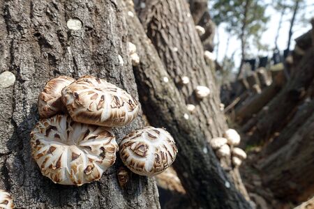 Tokyo, Japan - March 18, 2022: Closeup of log-grown or bed log cultivation shiitake mushroom