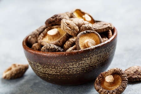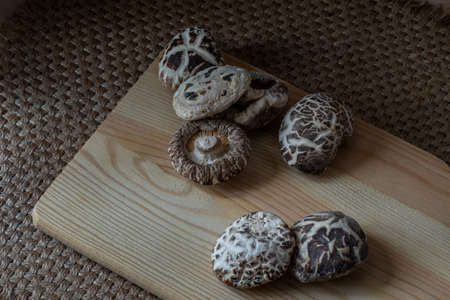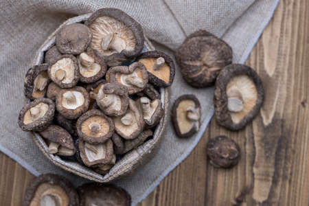 Dried shiitake mushrooms on craft paper. Healthy food.