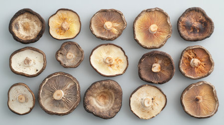 Mushrooms on a light yellow background, showcasing their textured caps and gills in a top down view, ideal for culinary and natural food imagery