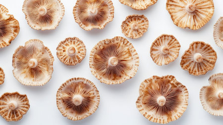 Discover a captivating arrangement of fresh brown mushrooms on a clean white background, showcasing their earthy texture and natural beauty for food-related projects.