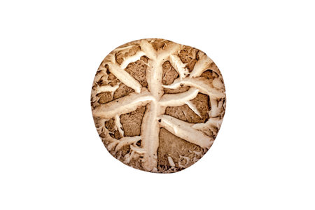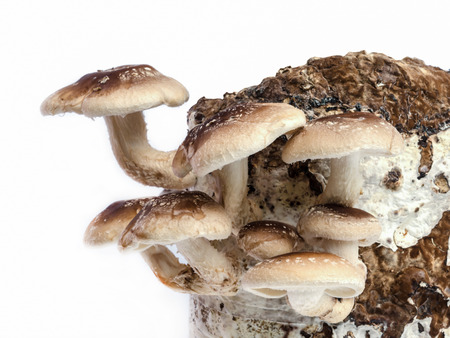 Shiitake Mushrooms on mycelium block. Traditional asian mushroom. Healthy organic medicinal food. Home growing. Studio shot on white background.