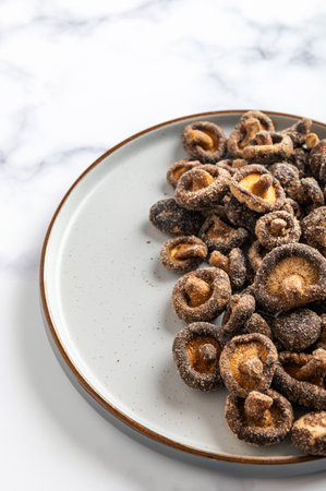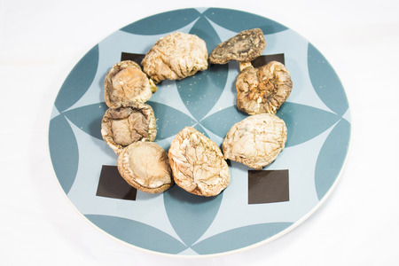 Top view of dried Shiitake Mushroom on blue plate. Isolated on white background