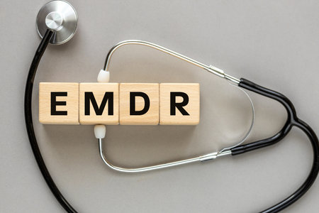 EMDR. Desensitization and reprocessing using eye movements. The concept of health. The abbreviation EMDR on wooden blocks. Stethoscope. Gray background. Flat setting. Duplicated space, close up.