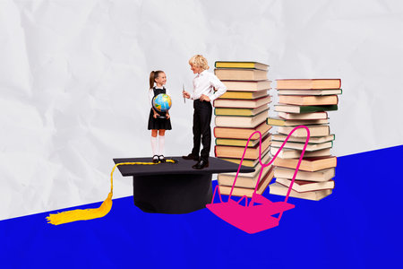 Collage picture of two smart happy mini kids stand big mortarboard hat hold planet earth globe pile stack book holder isolated on paper background