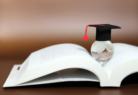 A transparent globe with a bachelor's cap on an open book. Global business learning.