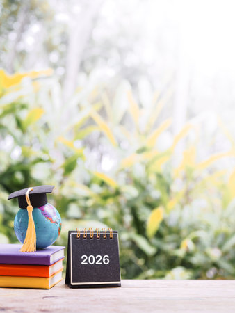 Student creative desktop, Earth globe with graduation hat on hardcover book and 2026 desk calendar. Copy space for text, Back to school, Education concept