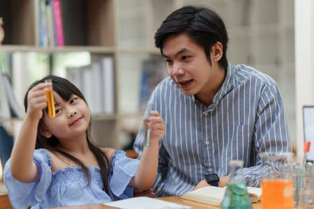 Little girl doing science experiments in the laboratory with father who looks through magnifying glass. Dad and daughter study biology and chemistry lessons with microscope. Homeschooling