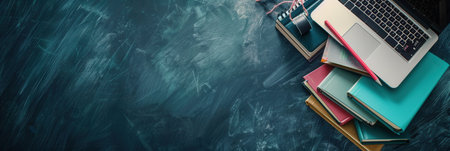 A stack of colorful textbooks and an open laptop on a blue desk, representing modern education and online learning.
