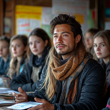 Cinematic wide-angle editorial image of a history teacher passionately guiding a lively discussion w