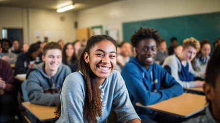 African student raises hand in classroom surrounded by classmates smiling and engaged in learning. Concept Education, Diversity, Classroom, African Students, Learning