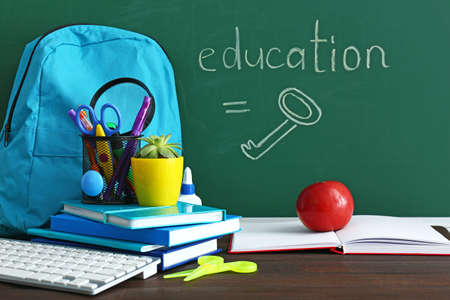 books and blackboard with drawing of a lightbulb and slogan education is power,learning,knowledge,back to school concept