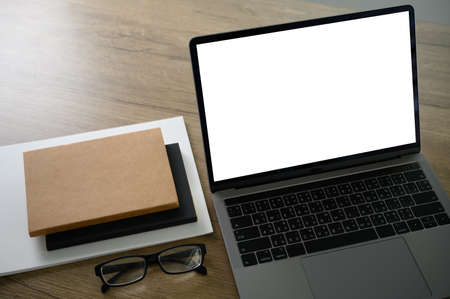 man of business man hand working on laptop computer on wooden desk Laptop with blank screen laptop on table
