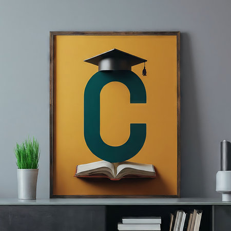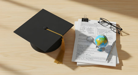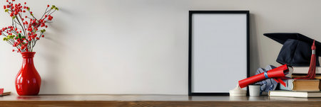 A significant graduation moment is showcased in an empty frame on a desk with books, a graduation cap, and a diploma, highlighting academic success.