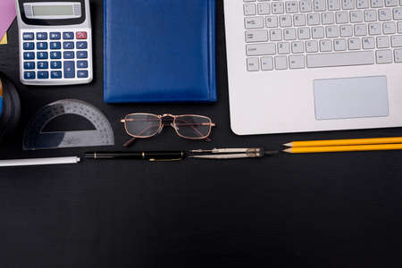 Cropped shot of workspace with laptop, stationery, supplies and copy space on black leather table