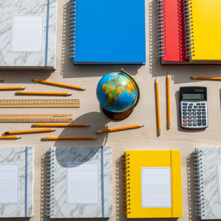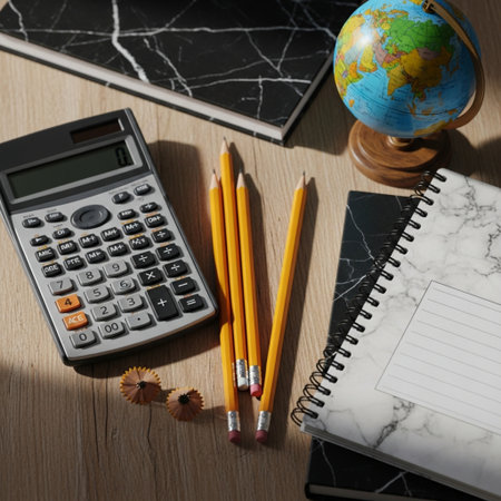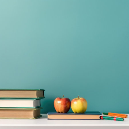 Desk is arranged with educational items such as an apple, clock, books, colored pencils, and a chalkboard. Numbers and symbols suggest learning and calculation activities.