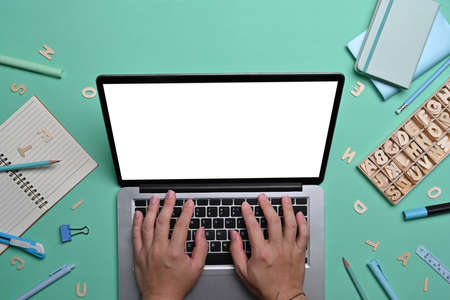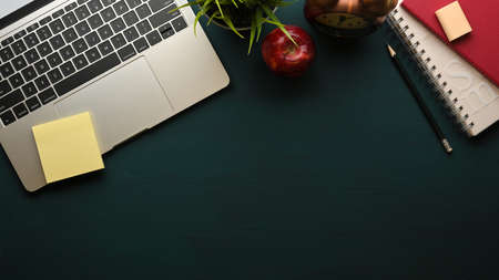 Top view of study table with laptop, stationery, decorations and copy space, school elements