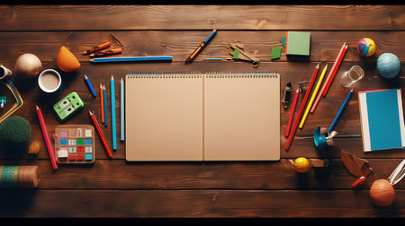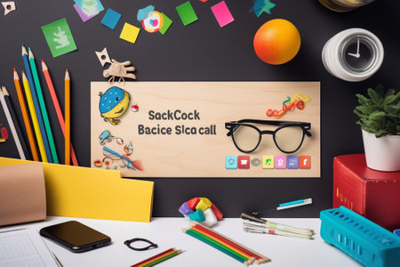 School chalkboard mockup on work desk. Composition of a student's desk with stationery items, toys, snack. Empty board for promo text