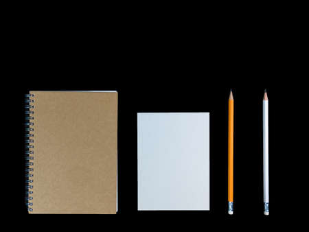 Clear color note book opened for note or lecture note or memo for remine and brown cover whit black head color pencil in white apparel in black background.
