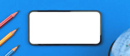 Education with modern technology mockup, mobile phone with blank white screen horizontally, copy space photo, blue office desk table with pencils and the globe