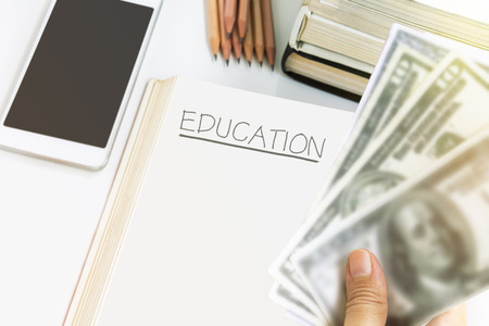 A woman's hand holding banknote with smartphone and wooden pencil on the pile textbooks on white table background. Money for education and business concept.