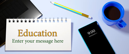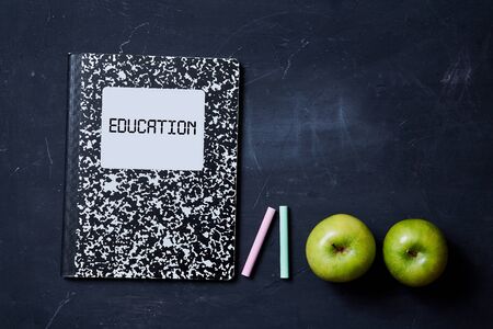 An open notebook is on the gray surface. The word Education is written on a blank sheet of notebook. There is a fountain pen on the notebook. Learning, education concept.