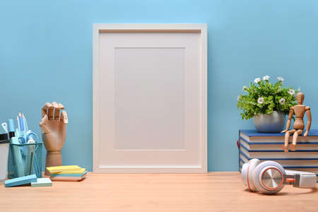 Empty picture frame, houseplant, and office supplies on wooden table.