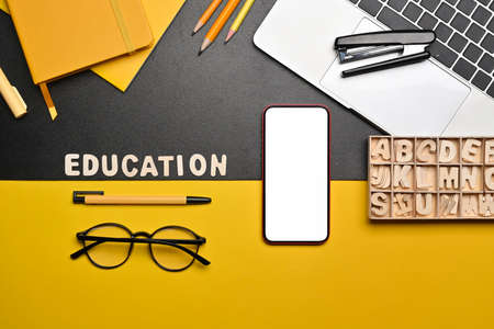 Top view smart phone, laptop computer and stationery on yellow background. Back to school concept.