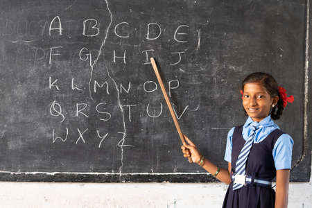 girl kid from blackboard at public school teaching alphabets to classmates by looking at camera - concept of intelligence, knowledgeable, development and education