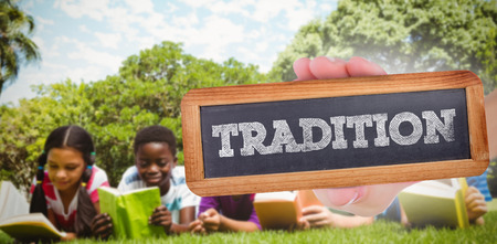 The word tradition and hand showing chalkboard against children lying on grass and reading books