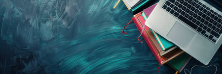 A laptop computer rests on top of a stack of textbooks, symbolizing modern educational methods.