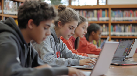 group of students is focused on collaborating for their project utilizing laptops in a well lit school library filled with books. The atmosphere is productive and engaging.