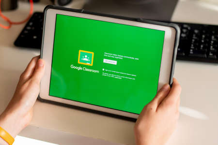 Sydney, Australia - 2020-04-06 Hands holding a tablet with Google Classroom application on screen. Coronavirus lockdown online education concept