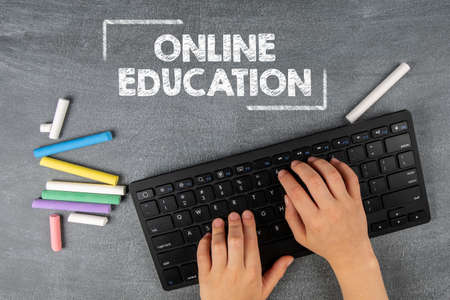ONLINE EDUCATION. Computer keyboard on a gray chalk board background