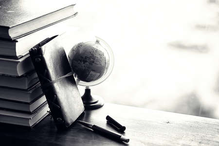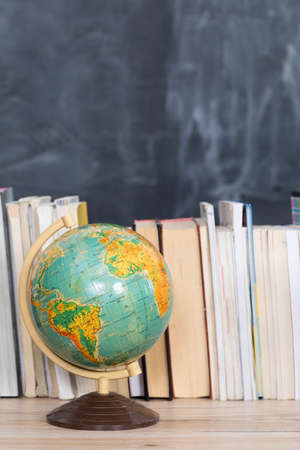 A globe with a black cap on top of it and a book with a pencil on it. The globe is surrounded by a lot of paper and pencils. Concept of education and learning