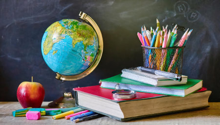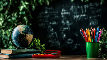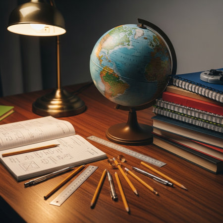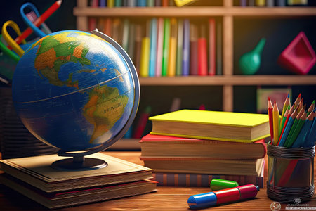 Study materials rest on a desk, featuring a globe, calculator, and colorful pencils.