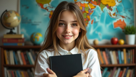 Girl holding a globe while teaching geography to two eager students in a vibrant classroom, fostering curiosity and knowledge about the world