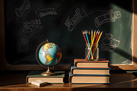 A shot of a classic classroom desk with simple educational items. On the left, a globe rests on a thick book. On the right, a stack of three books is topped with a glass jar filled with colored pencils. The background is a green chalkboard covered in various white chalk drawings and writings, with a diagonal beam of sunlight illuminating the desk. The scene has a warm, nostalgic feel, reminiscent of an old-fashioned classroom.