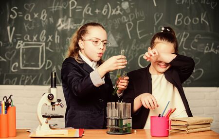 Pupils cute girls use test tubes with liquids. Chemistry experiment concept. Safety measures for providing safe chemical reaction. Basic knowledge of chemistry. Make studying chemistry interesting