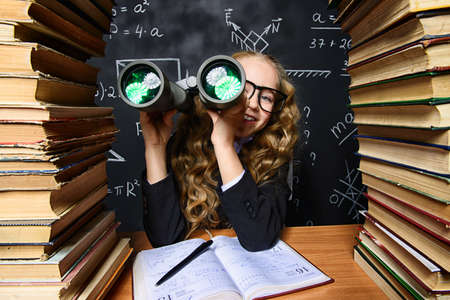 Portrait of a smart schoolgirl looking through binoculars. Books and school blackboard. Educational concept.