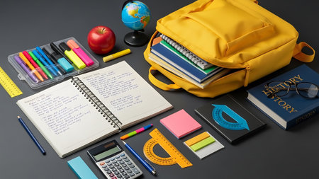 A yellow backpack and school supplies such as notebooks, pens, pencils, and a calculator are arranged on a table.