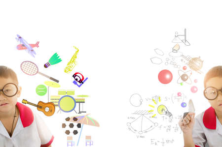 Back to school concept. Top view image of two kids over blue background