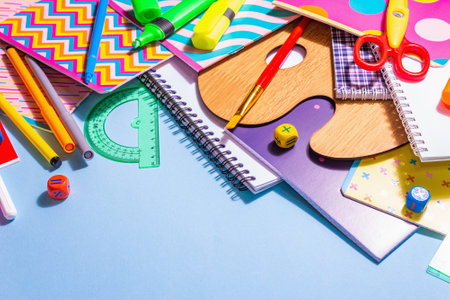 Stationery accessory on blue background. School supplies, pencils, paints, scissors, and colored notebooks. Education and freelance work concept, copy space