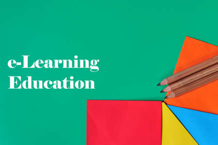 Education concept in reference to online learning. Colored papers, pencils with text 'e-Learning Education'. Selective focus points