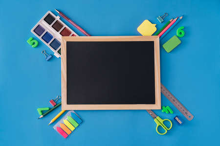 Stationery chalk board. Back to school. Copy space