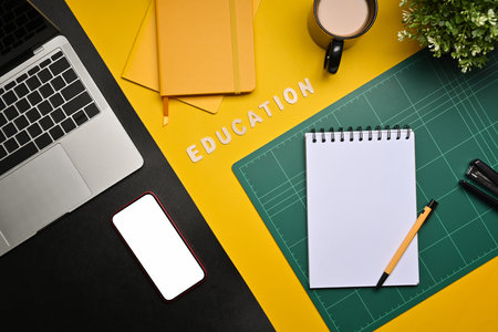 Top view of workspace with smartphone, laptop, earphone, books and stationery on study table