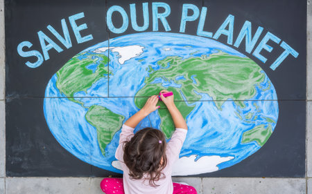 Girl drawing planet earth with chalk on the street, symbolizing the importance of environmental protection and sustainability